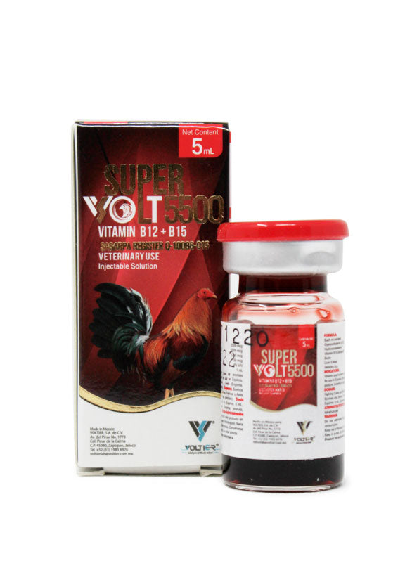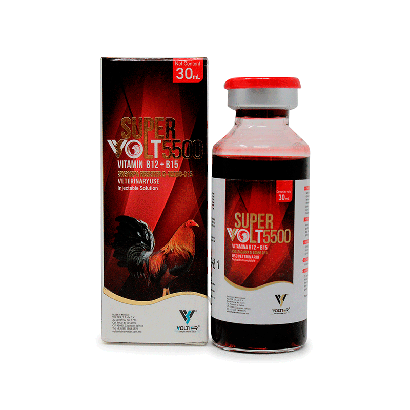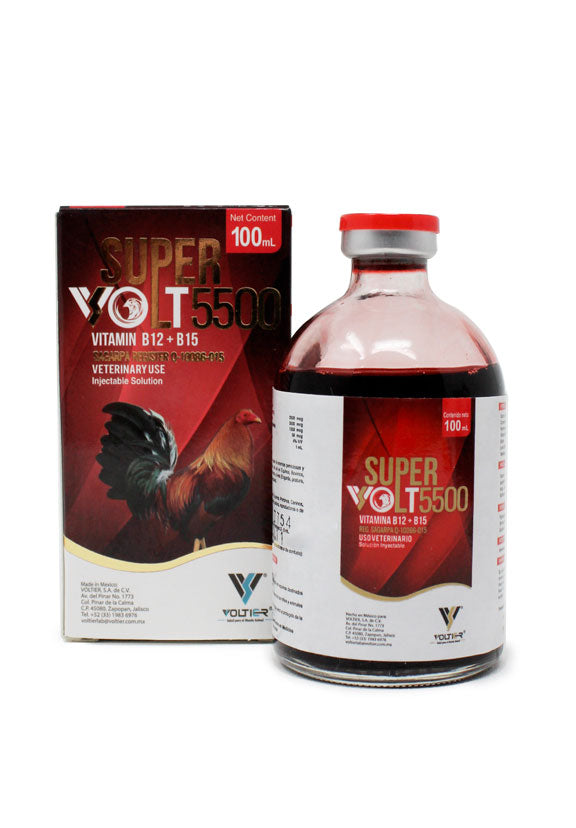 Super Volt 5500 es un complejo vitamínico de Voltier que contiene Cianocobalamina (B12), Hidroxocobalamina, Vitamina B15 y Biotina, formulado para equinos como estimulante del apetito y tratamiento de anemias perniciosas.