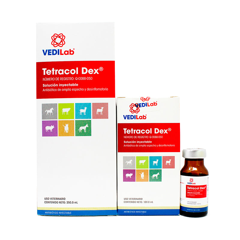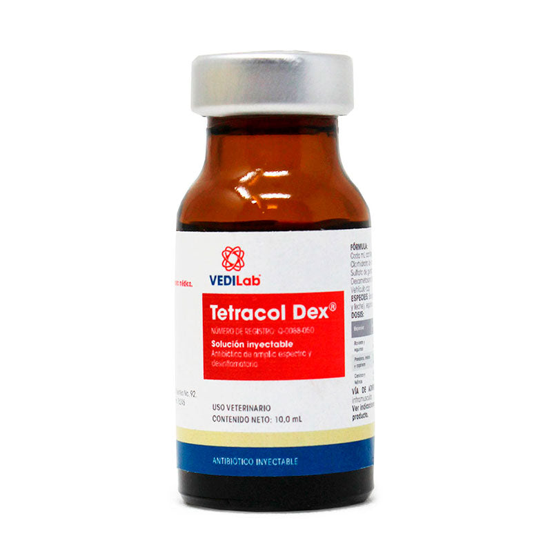 Tetracol Dex® de VEDILab es un antibiótico de amplio espectro combinado con un antiinflamatorio, formulado con Clorhidrato de oxitetraciclina, Sulfato de gentamicina y Dexametasona. Está indicado para el tratamiento de diversas infecciones bacterianas en bovinos.