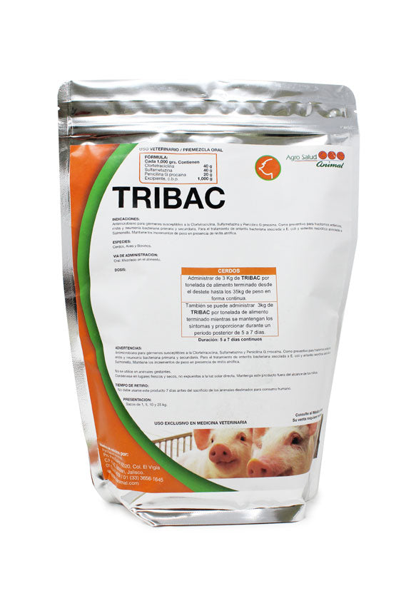 Tribac sirve como antimicrobiano para gérmenes susceptibles a su fórmula combinada. Se usa como preventivo para trastornos entéricos, rinitis y neumonía bacteriana, y para tratar enteritis bacteriana asociada a E. coli y Salmonella. Además, mantiene los incrementos de peso en presencia de rinitis atrófica.
