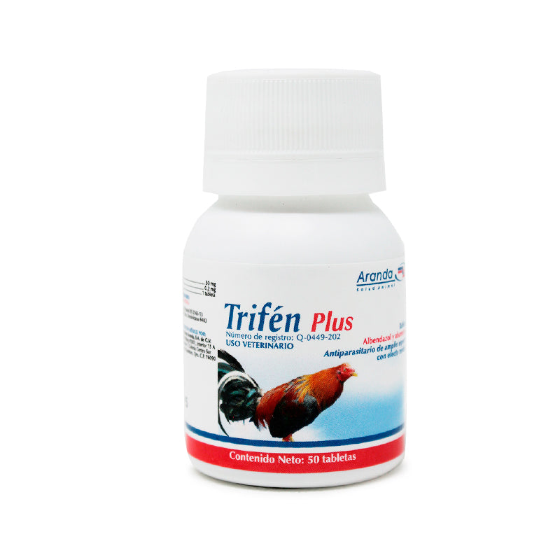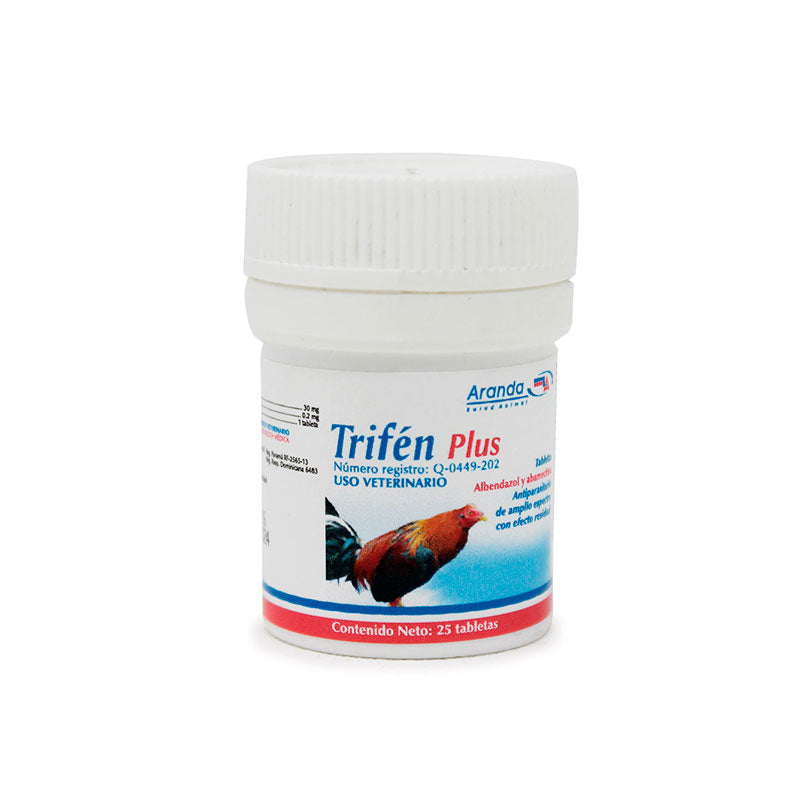 Trifén Plus es un antiparasitario de amplio espectro con efecto residual de la marca Aranda, formulado con Abamectina y Albendazol, para uso en aves, especialmente gallos de alto registro y ornato.