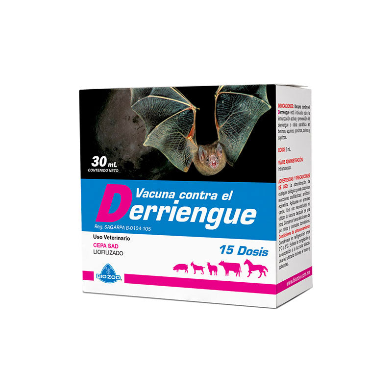 Vacuna contral el Derriengue de Biozoo es una vacuna con virus activo modificado de Rabia cepa SAD, indicada para la inmunización activa y prevención del derriengue o rabia paralítica en bovinos.
