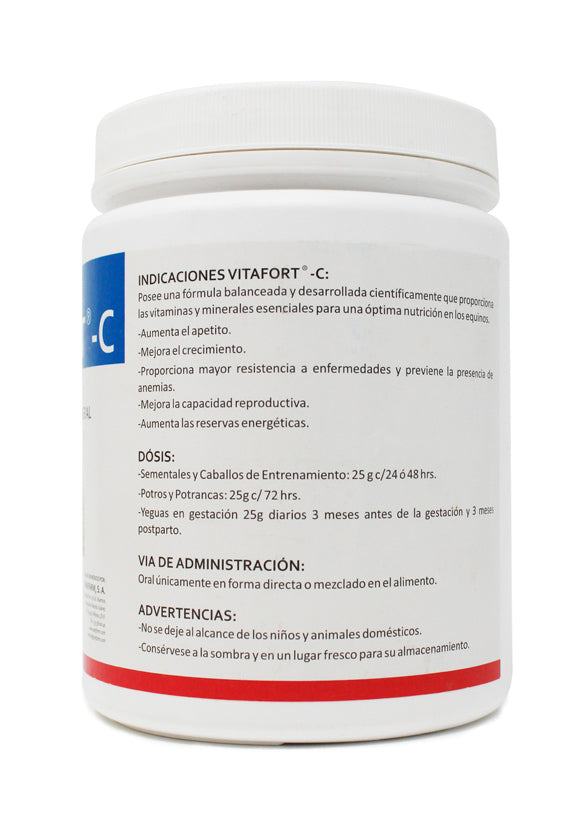 VITAFORT®-C Posee una fórmula balanceada y desarrollada científicamente con las vitaminas y minerales esenciales para una óptima nutrición en los equinos: Aumenta el apetito Mejora el crecimiento Proporciona mayor resistencia a enfermedades y previene la presencia de anemias Mejora la capacidad reproductiva Aumenta las reservas energéticas.