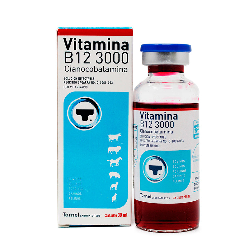 Vitamina B12 3000 es un suplemento vitamínico de Cianocobalamina, elaborado por el laboratorio Tornel, indicado para todas las especies. Su uso principal es prevenir la deficiencia de vitamina B12 y actuar en la formación de glóbulos rojos.