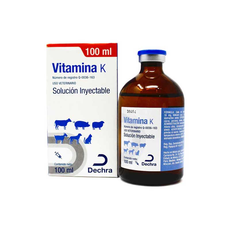 Vitamina K 100 ml sirve para el tratamiento de hemorragias y trastornos de la coagulación sanguínea en animales de todas las especies. Es fundamental en la síntesis de factores de coagulación.