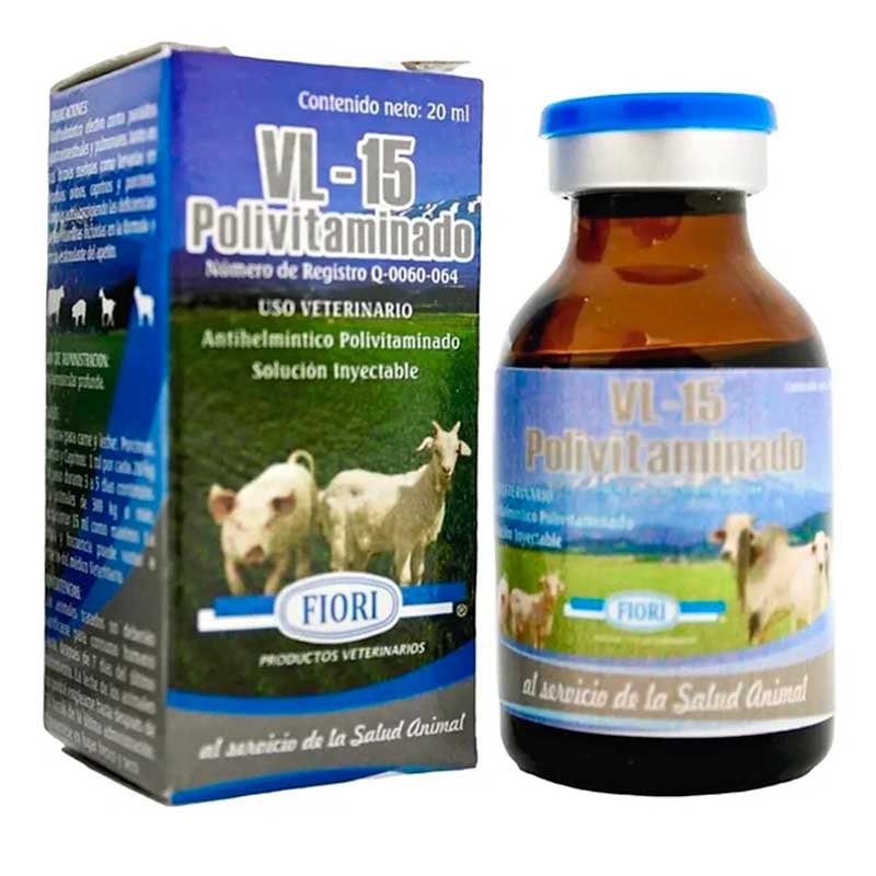 VL-15 Polivitaminado 20 ml es un suplemento polivitamínico inyectable de Fiori, formulado para bovinos. Su composición de vitaminas A, D3, E y complejo B está diseñada para corregir deficiencias nutricionales y apoyar el metabolismo general del ganado.