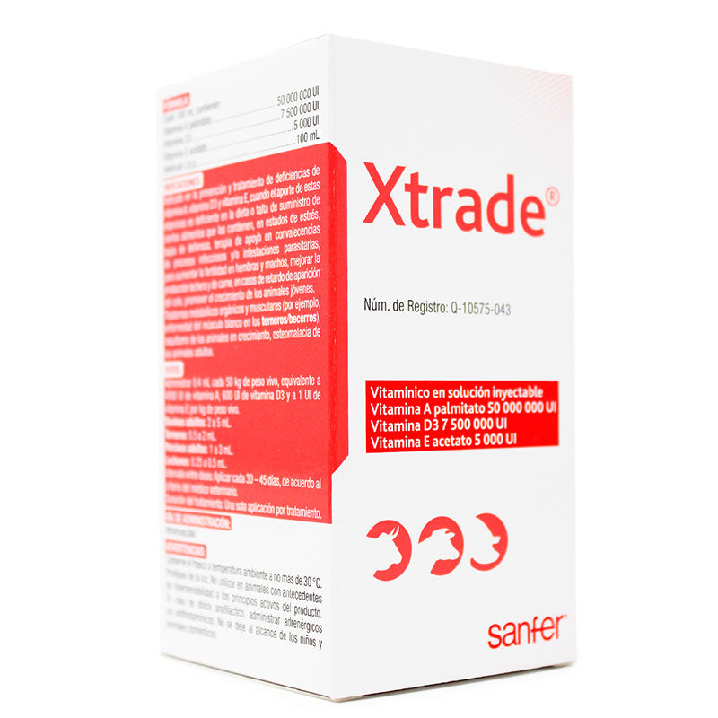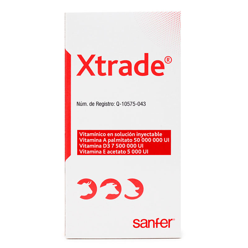 Xtrade® es un multivitamínico inyectable de Sanfer, formulado con vitaminas A, D3 y E. Está indicado para todas las especies, para prevenir y tratar deficiencias vitamínicas en la dieta, estados de estrés y bajas defensas.